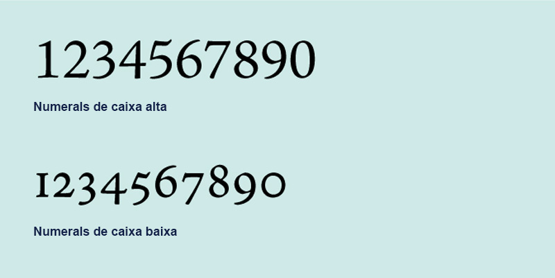 • Els numerals de caixa alta, també anomenats xifres capitals, tenen la mateixa altura que els caràcters de caixa alta i comparteixen els mateixos atributs, tant d’ample com d’interlletratge (o de kerning, en anglès). Són especialment útils per ser usats en taules o qualsevol altre element de disseny o maquetació on es combinin amb les caixes altes.